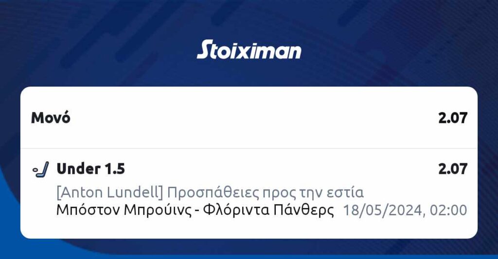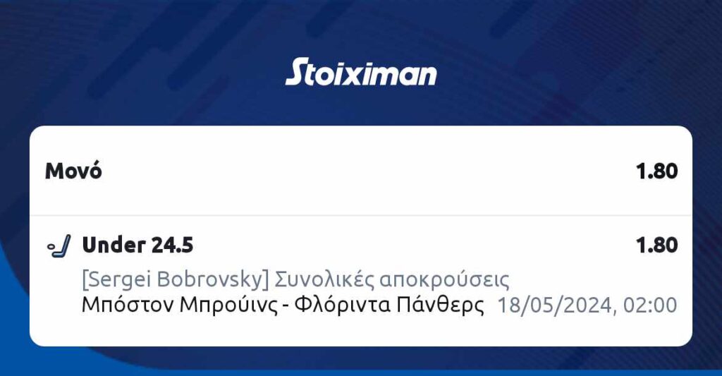 O Bobrovsky στα πέντε (5) ματς έως τώρα, μόλις στο 1 ξεπέρασε το line και ήταν στο τελευταίο χρονικά. Οι εταιρείες τον είχαν κατεβάσει σαν όριο και το ξανά ανέβασαν. Μεγάλο λάθος για μένα..